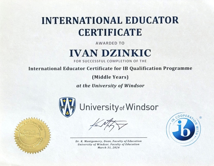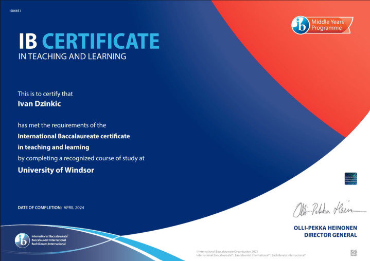 This diploma attests to the knowledge I gained from Category 1 IB specific study in the Middle Years Programme at the University of Windsor, Canada.
