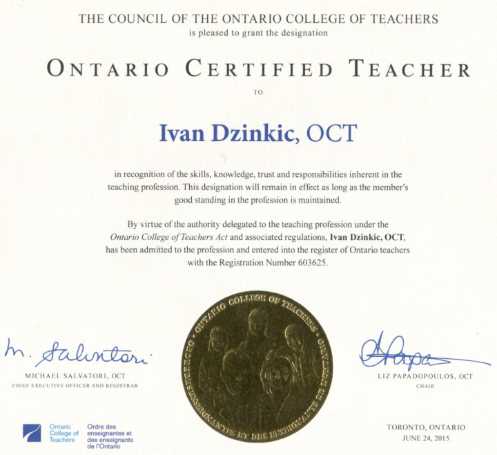 As an Ontario Certified Teacher, I am licensed to work anywhere in Canada.